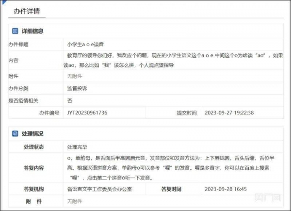 日前,有"较真儿"的家长带着这个问题直接找到了山东省教育厅。9月27 日,有人在山东省教育厅网站"留言咨询"栏目中,提出了自己的疑问:现在的小学生语文"a o e" 中间这个o为啥读"ao"?