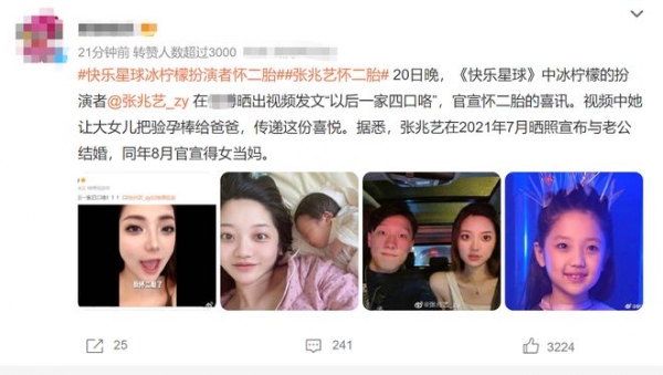 8月21日,据媒体报道,《快乐星球》中"冰柠檬"的扮演者张兆艺官宣怀二胎,并分享了自己通知老公的画面,引发持续热议。