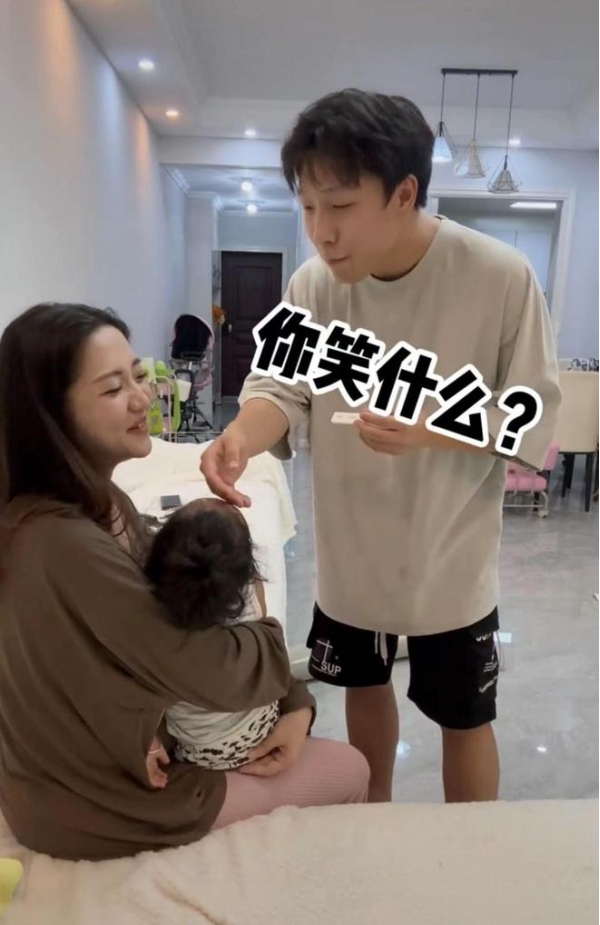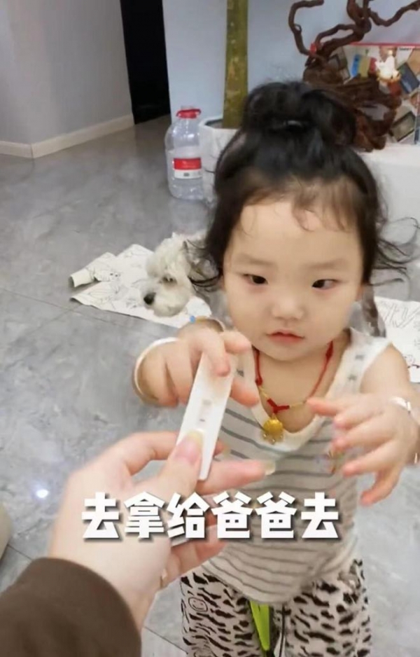 张兆艺将验孕棒放到女儿手中,让女儿帮她交给老公宝哥。