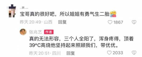 还有人感慨地说道,宝哥应该非常好,所以张兆艺才有勇气生二胎。对此,张兆艺表示宝哥好得无法形容,此前他顶着39度高烧,也坚持起来照顾她们母女俩。