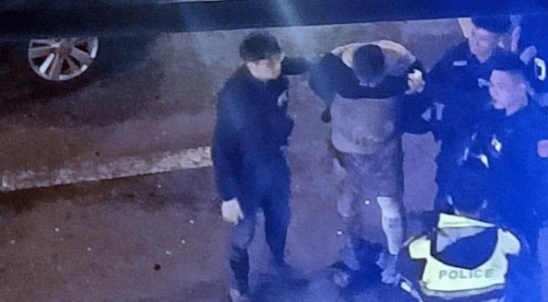 当歹徒因为红灯卡在车阵后,围捕的警员立即下车准备逮人,未料杨男竟朝冲上前逮捕他的蔡姓警员(22岁)开了数枪,蔡员左肩中弹倒地,仍负伤开枪还击12枪。其他围捕警员亦纷纷拔枪朝杨男射击,顿时枪声四起,路过的人车纷纷闪避。因杨男身著防弹背心,虽身上中弹,却仅背部红肿,路上绿灯亮起后,杨男驾车继续逃逸,最后由警方以优势警力在桃园区永安路和富国路口将杨男逮捕到案。