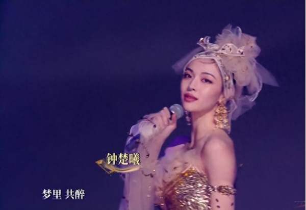 一身鎏金薄纱裙,一首梅艳芳的《梦里共醉》,不仅是造型中有梅姑的影子,唱得也有梅姑的神韵,歌曲中很有故事感,整个布景也都充满了年代气息。