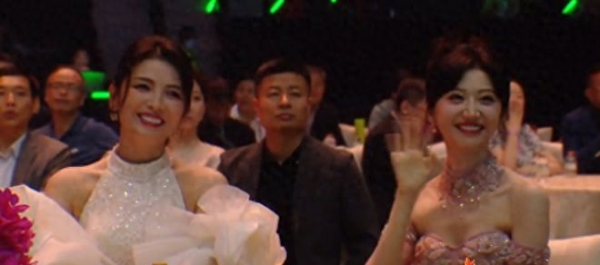 颖儿则是一身金属色斜肩礼服,典雅大气,透出一股成熟美。