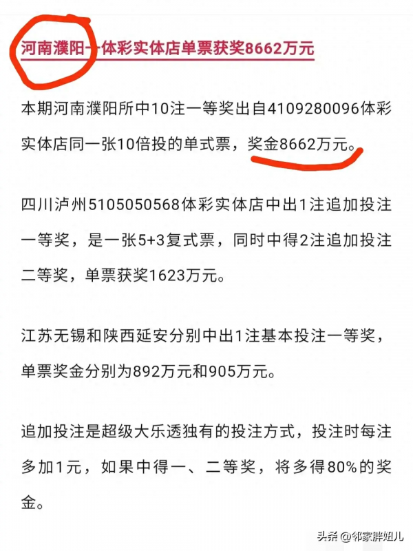 本期全国共开出13注一等奖。其中,1注为1559万元(含692万余元追加奖金)追加投注一等奖,落户四川泸州;12注为866万余元基本投注一等奖,分落河南濮阳(10注)、江苏无锡、陕西延安。