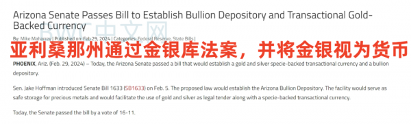 而这种方法正在被美国多个州效仿,货币独立在美国多州相继上演。事情的最新进展是,2月29日,亚利桑那州参议院通过了一项名为SB1633的法案,该法案将建立一种以黄金和白银为支撑的交易货币和金条存放处。并将促进黄金和白银作为法定货币以及以硬币为支撑的交易货币的使用。