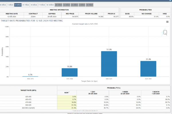 自2022年3月以来,美联储已开启11轮加息,特别是自去年7月以来,基准利率始终维持在 5.25%-5.5%的范围,根据芝商所的美联储观察工具3月1日最新预测,虽然5月份之前降息的空间有限,但6月降息的概率已达到68.6%。此前美联储政策制定者预计他们最终可能会在2024年底前将利率下调至4.5%-4.75%的水平。