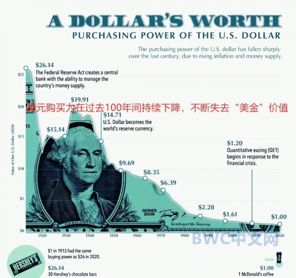 与此同时,一旦美联储以洪水猛兽般的速度反转为大印钞大放水,美元新的贬值,并失去美金价值的周期也将再次开启。如下图,过去一百年间,毫无节制的印钞和不断推动美国国债货币化进程中,美元的购买力已经下降近99%。尽管美联储一般会在显著通胀后,收紧货币政策,但这几乎并没有从根本上解决美国长期存在的通货膨胀问题。
