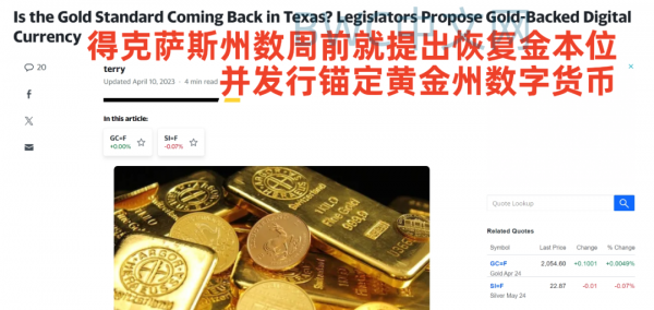不仅于此,数周以来,在美国的得克萨斯州,锚定黄金的州数字货币正在被持续推进。得州参议员布莱恩·休斯和众议员马克·多拉齐奥认为,建立以金本位为基础的,得州黄金数字货币,将打破美联储不断炮制美元泡沫,回归金本位对所有人都是公平的。
