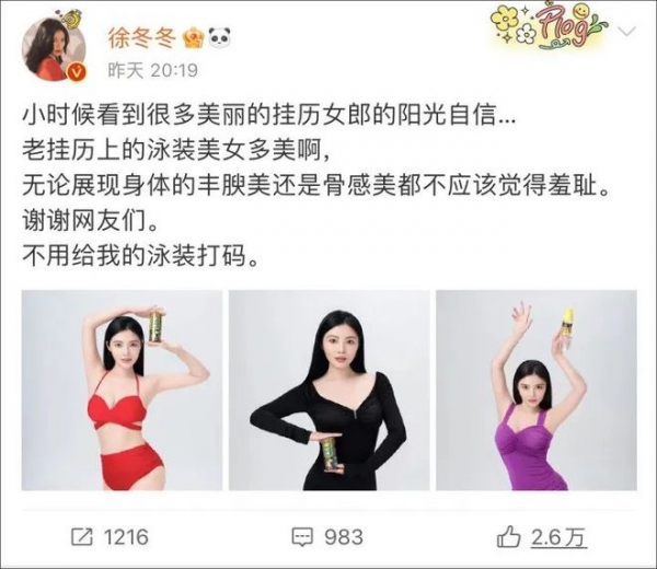 6日晚,椰树代言人,女演员徐冬冬发文回应争议:"小时候看到很多美丽的挂历女郎的阳光自信…老挂历上的泳装美女多美啊,无论展现身体的丰腴美还是骨感美都不应该觉得羞耻。谢谢网友们。不用给我的泳装打码。"