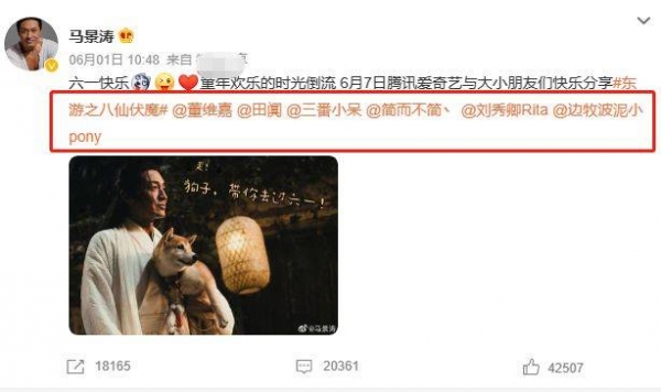 如果你认为她只是单纯地秀恩爱,那你就想错了。她在秀恩爱的同时,还喊话了几位明星。如果仔细的话观察的话会发现,她艾特的人,都是和马景涛共同拍摄《东游之八仙伏魔》的人。这波操作,也是暗搓搓地给对方做宣传了。