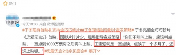 接着于冬话锋一转,开始指点了起来:"……你们不应该叫上映,应该叫点映,一直点到一千万票房之后再叫上映,这招啊都是跟猫眼学的"。