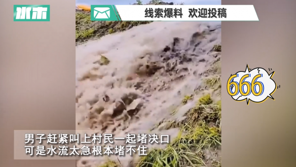 男子赶紧叫上村民一起堵决口,可是水流太急根本堵不住。