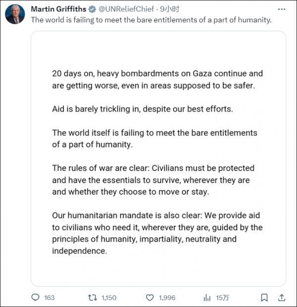格里菲斯在社交媒体上发文称,在过去20天里,对加沙地带的猛烈轰炸愈发严重,一些本该安全的地区也已经陷入危险,但援助物资却很难进入加沙地带,"世界没能满足一部分人的基本权利"。