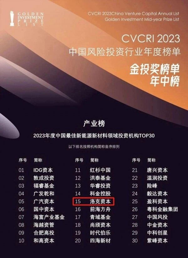 公开资料显示,在创投圈,洛克资本登上过不少知名榜单。某知名风投研究院今年推出的"2023年度中国最佳新能源新材料领域投资机构TOP30"榜单,洛克资本就与IDG资本、红杉资本等知名机构一起榜上有名。