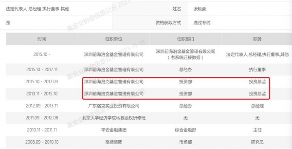 从公开信息看,张颖豪曾就职于高盛、平安金融,且曾任洛克资本前身深圳前海洛克基金管理有限公司投资部投资总监。