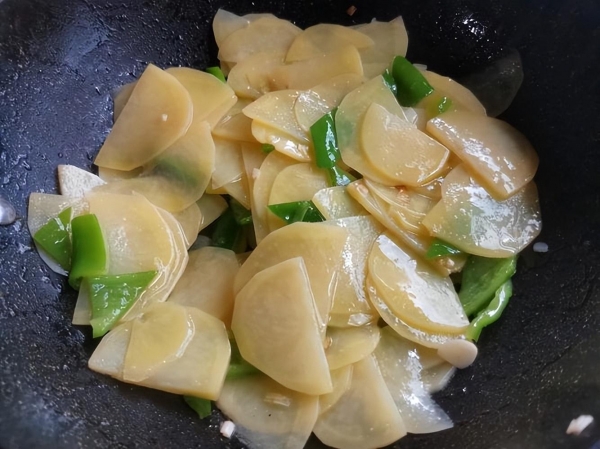 锅留底油,五花肉片下锅炒香后,放葱姜蒜干辣椒,八角炒香,放点蚝油生抽陈醋,然后把土豆片下锅,翻炒两下后,加入一勺清水,炖上二分钟,二分钟汤汁收浓后,把青红辣椒片下锅,大火翻炒均匀,美味的炒土豆片就做好了赶紧做起来吧,