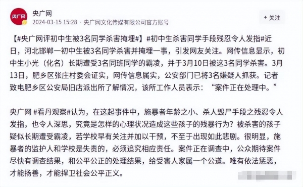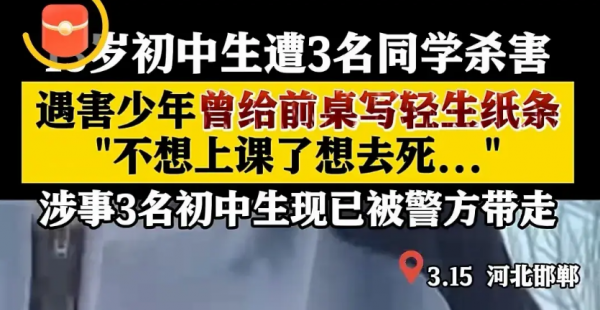 近日,河北邯郸三名初中生残忍杀害同学小光的事件引发了广泛的关注。三名嫌疑人也已被警方控制。