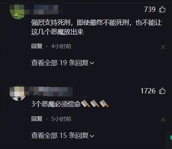 尽管如此,不少网友对于三人的行为还是恨得咬牙切齿,希望相关部门严惩不贷,让他们为自己的行为付出惨痛的代价,最好是S刑。