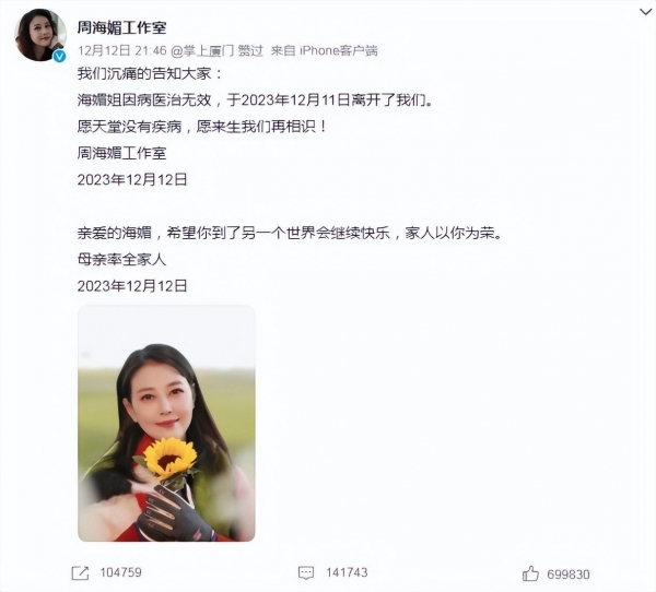直到12月12日,周海媚工作室正式通知粉丝和网友,周海媚在送往医院后救治无效去世,具体去世时间是12月11日。本来大家以为事情就这样过去了,谁知接下来发生的事情却让网友们愤怒了!