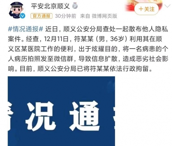 2023年12月14日,顺义公安分局针对"周海媚"病历泄露这件事对肇事者进行了通报处理。经查实,在12月11日,符某某利用他在顺义某医院便利,将周海媚个人隐私泄露出去。