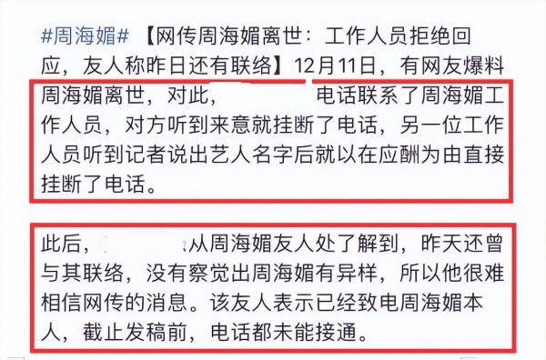 为了确认消息的真假,也就在当天,有记者致电周海媚工作室,在工作人员接通之后对于周海媚去世问题直接拒绝回答,甚至直接挂掉,这让网友心再次沉了下去,静待官方发布消息。