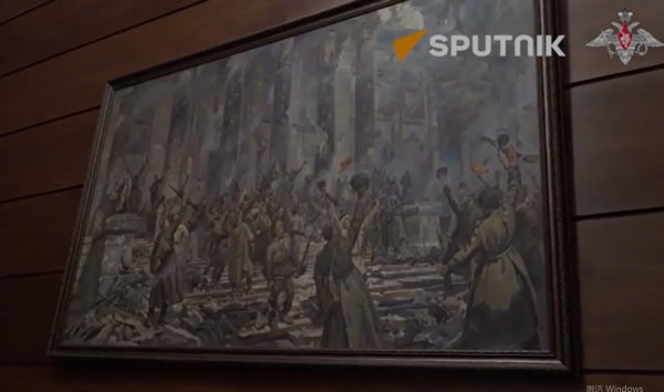 在会谈开始前,俄方为中国军事代表团举行了盛大的欢迎仪式。绍伊古携张又侠步入会场时,特意展示了位于大楼内的一幅画。画中描绘的是二战的盟军英雄,而背景则是德国国会大厦。