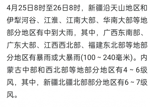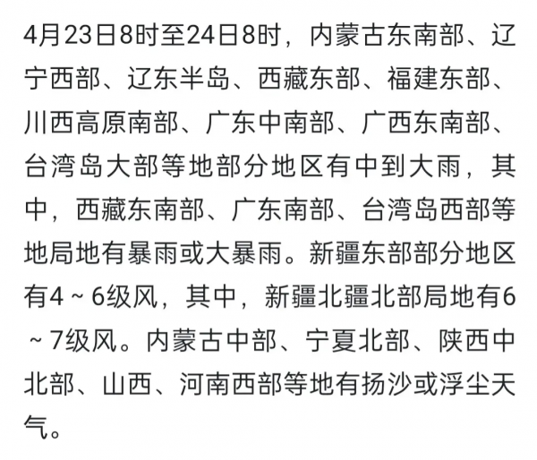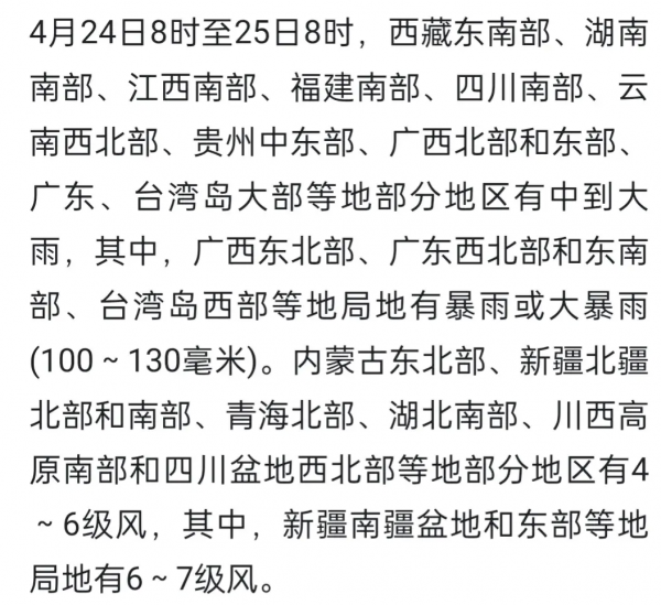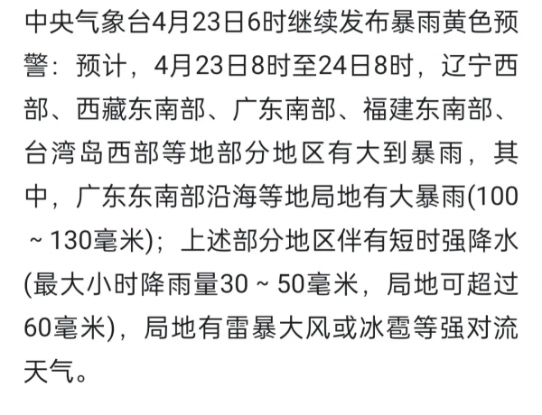 4 月 23 日,据中央气象台网站确切消息,中央气象台于该日 6 时正式发布暴雨蓝色预警:预计 4 月 23 日 8 时至 24 日 8 时期间,广东多数地区、广西东南部、福建南部等地的部分区域将出现大到暴雨情况。其中,广东沿海等地的局部地区更有大暴雨(100~130 毫米)。此外,上述部分地区还伴有短时强降水(最大小时降雨量在 30~50 毫米之间,局部地区可能超过 60 毫米),以及雷暴大风或冰雹等强对流天气。