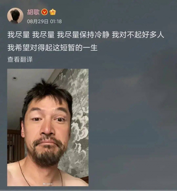 8月29日凌晨1点,胡歌在深夜突然发出一张胡子拉碴的素颜自拍照,并称"我尽量保持冷静,我对不起好多人,我希望对得起这短暂的一生"。