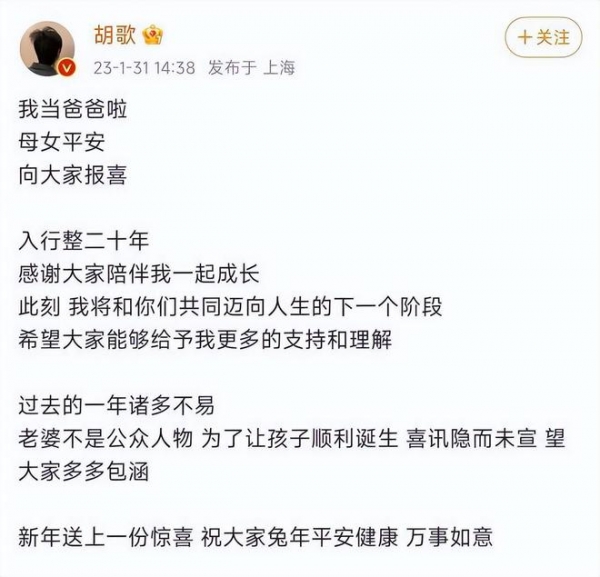 今年1月31日,胡歌发文宣布结婚生女喜讯:"我当爸爸啦,母女平安,向大家报喜",他还透露,妻子不是公众人物,为了让孩子顺利出生,因此喜讯隐而未宣,希望大家多多包涵。随后,有网友扒出,胡歌的妻子正是已经在他身边陪伴多年的贴身助理黄曦宁。
