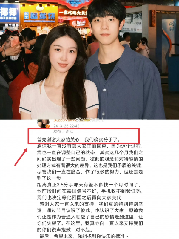 又一对恋综CP官宣分手,分手原因现实,男方态度稍显卑微