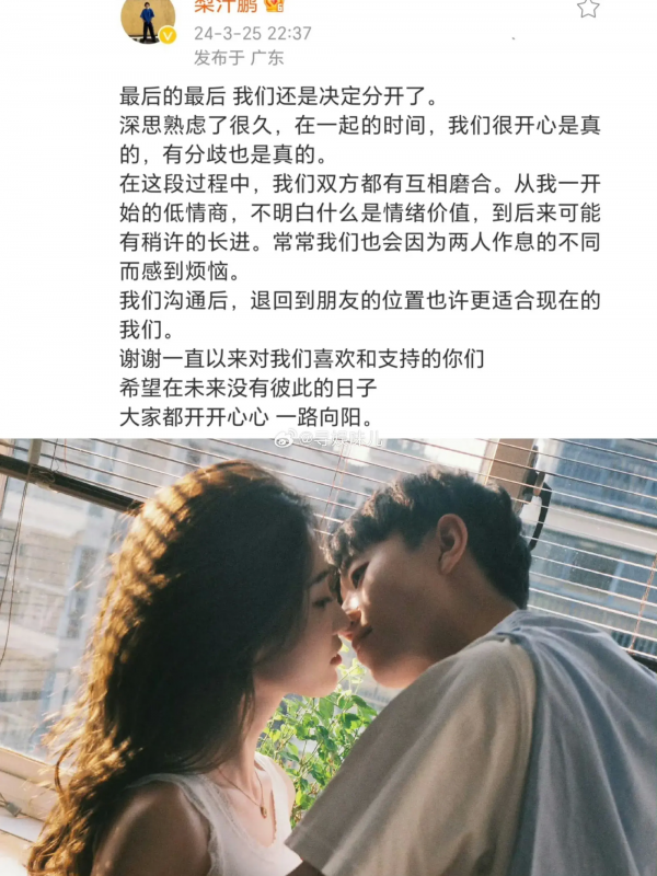 李志鹏和周欣然于25日晚双双宣布分手,