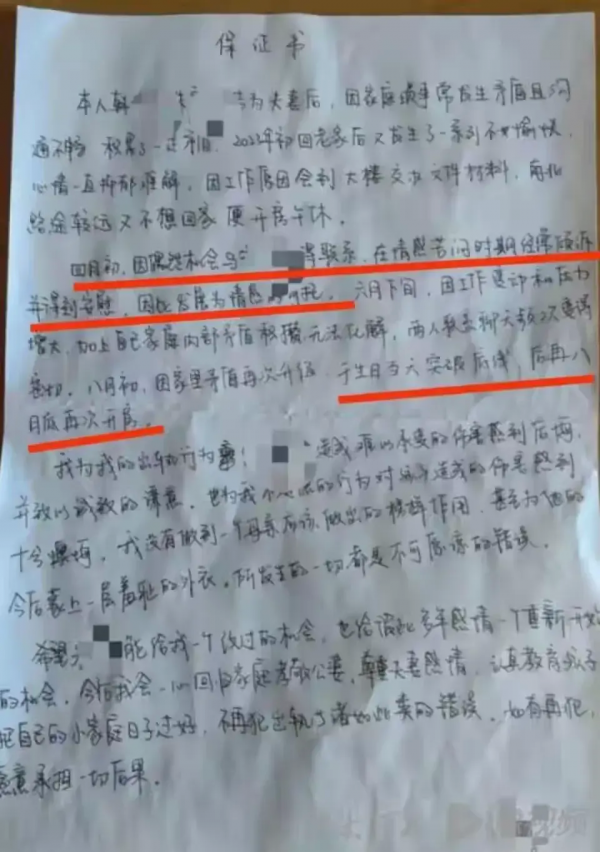 还有一份疑似儿媳妇在东窗事发后,为了求得家庭的原谅手写的一份保证书,表达了悔改的意愿。