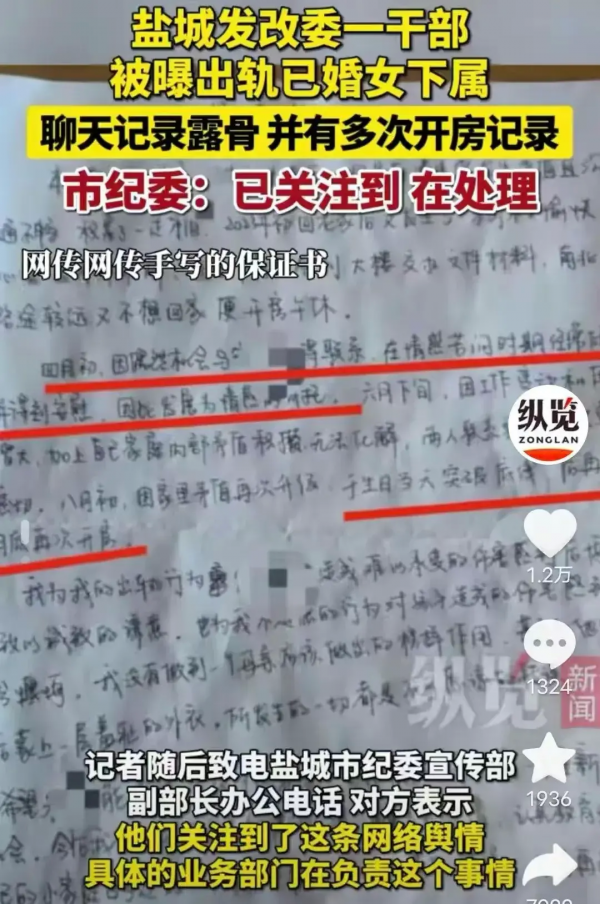 最新消息是,江苏盐城市纪检委表示,他们已经关注到了网络舆情,并且在第一时间掌握了存在的问题,现在有部门在负责调查这个事情。