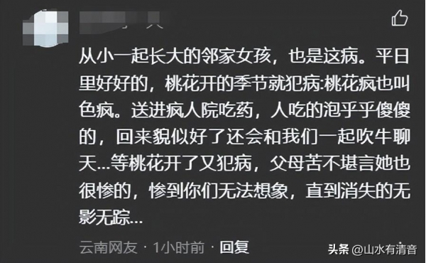 从小一起长大的邻家女孩,也是这病。平日里好好的,桃花开的季节就犯病:桃花疯也叫色疯。送进疯人院吃药,人吃的泡乎乎傻傻的,回来貌似好了还会和我们一起吹牛聊天…等桃花开了又犯病,父母苦不堪言她也很惨的,惨到你们无法想象,直到消失的无影无踪…