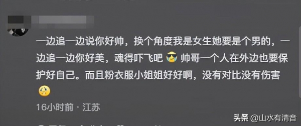 一边追一边说你好帅,换个角度我是女生她要是个男的,一边追一边你好美,魂得吓飞吧,帅哥一个人在外边也要保护好自己。而且粉衣服小姐姐好好啊,没有对比没有伤害!