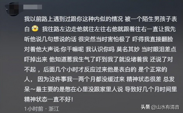 莫名其妙!当时眼泪差点吓掉出来,他知道惹我生气了,吓到我了就没堵着我,还说了对不起,后面几个小时才反应过来他是表白的,是个正常的人,因为这件事我一两个月都没缓过来,精神状态很差,总发呆~最主要的是憋在心里没跟家里人说,导致好几个月时间里精神状态一直不好!