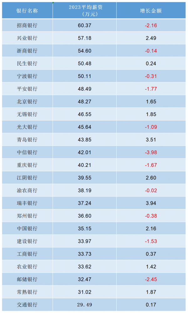 从2023年部分银行的薪酬水平来看,有不少银行平均薪酬都出现了下降,其中招商银行平均薪酬下降2.16万,平安银行平均薪酬下降1.77万,中信银行平均薪酬更是下降了3.98万。