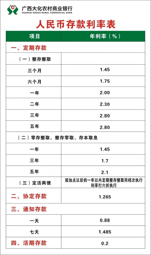 5月1日,广西大化农商行发布公告对利率进行调整,调整之后一年期利率为2%,两年期利率为2.3%,三年期和五年期利率都为2.8%。