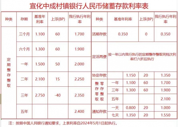 在5月3日,宣化中成村镇银行发布新的存款利率表,其中一年期利率下降到2%,两期利率下降到2.25%,三年期利率下降到2.35%,5年期利率下降到2.4%。