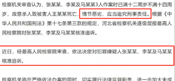 什么意思?意思就是这次的案件经过了最高人民检察院的确认,这三名凶手将会被追究"刑事责任"。