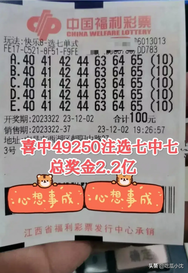 12月2日晚,福彩"快乐8"第23322期开奖中,选七玩法头奖井喷50159注引爆全网,据目前曝光的信息显示,江西某销售网点中出当期选七玩法其中的49250注,如果曝光的信息属实,那么该得主将收获2.2亿元巨奖,且不用缴税。