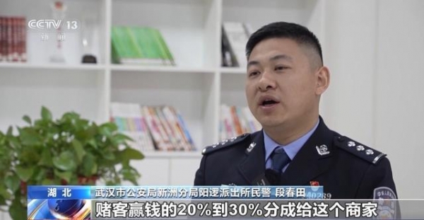 武汉市公安局新洲分局阳逻派出所民警 段春田:赌客赢钱的20%到30%分成给这个商家,商家再向技术员提供200到1000不等的每场好处费。
