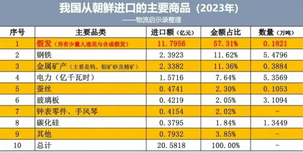 我国对朝鲜出口141.20亿元,同比增长151.9%,我国对朝鲜进口20.58亿元,同比增长127.1%。去年我国从朝鲜进口的商品中,57%都是假发,高达1821吨,进口额为11.8亿元