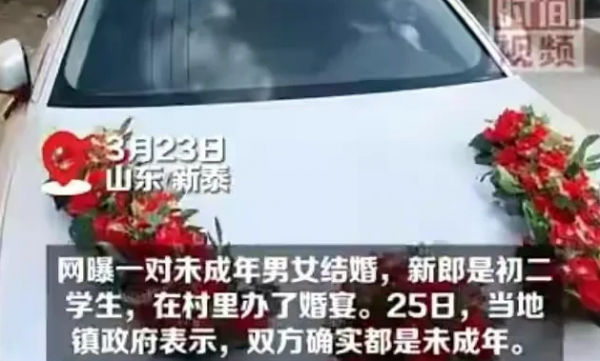 近日,山东新泰,网上流传一则结婚的视频,两孩子都是未成年,新郎是初二学生,从视频中看见两个人的稚气未脱,女孩娇羞娇羞的,双方父母张灯结彩,在村里大摆宴席。