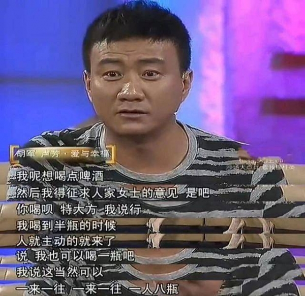 私下里第一次约会,胡军点了啤酒,卢芳也主动要求喝一点,就这样两人一来一往,一起喝了16瓶啤酒,卢芳爽朗大方的性格征服了胡军的心,两人演完话剧后开始交往。
