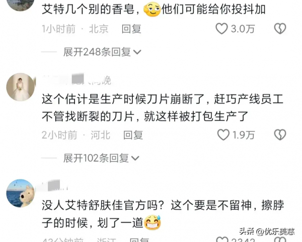 新闻发布以后,网友们纷纷跑到舒肤佳品牌官方号去留言,质问为何明知道可能会有刀片还在卖给消费者?