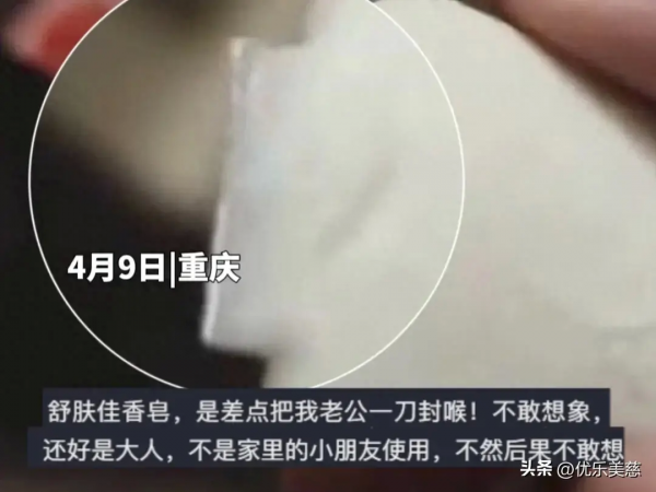 据4月10日《维度新闻》报道,家住重庆的胡女士(化名)告诉记者。4月9日晚上自己爱人在洗澡时发现感觉浑身上下刺痛,一看之下发现用的肥皂内竟然惊现有刀片。