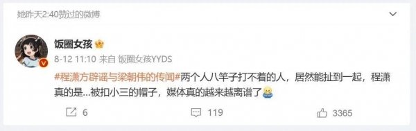 而在微博上,刘嘉玲还点赞了一个娱乐博主称梁朝伟和程潇传绯闻很离谱的评论,用这样的方式为老公"打假"。
