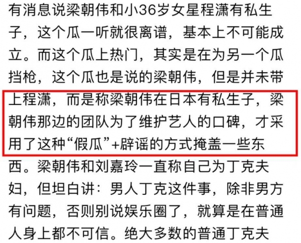 不过,有的娱记提供了新思路:最初版本的瓜其实是梁朝伟在日本有私生子,梁朝伟的团队为了维护艺人的口碑,采取假瓜+辟谣的方式拉程潇下水,实际上是想掩盖梁朝伟有私生子这个事实。
