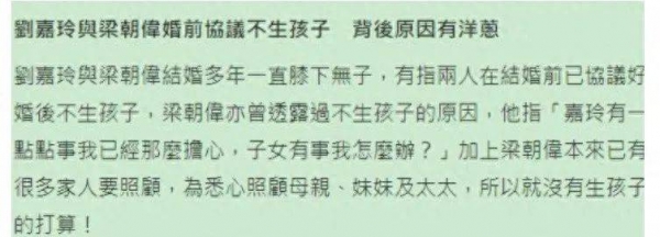 梁朝伟与刘嘉玲相识三十多年,于2008年结婚,婚后多年来一直没有生育。两人也在多个场合分别提到不要孩子的原因。梁朝伟那边的说法是,"嘉玲有一点点事我已经那么担心,子女有事我怎么办?"他表示,有母亲、妹妹和太太要照顾,已无心力再养育孩子。